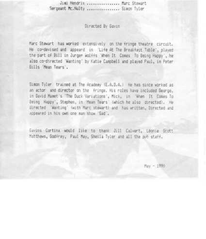 Marc Stewart has worked extensively on the fringe theatre circuit. He co-devised and appeared in "Life At The Breakfast Table", played the part of Bill in Jurgen Wolffes "When It Comes To Being Happy", he also co-directed "Wanting", by Katie Campbell and played Paul in Peter Gills "Mean Tears".
